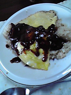 レストランとかで出てくるオムライスを目指してみたんだぜ。…っていっても塩コショウで味付けして炒めた冷凍ご飯に卵焼きのっけて、その晩に食べるように作ったビーフシチューをさらっとかけたものだけどね。